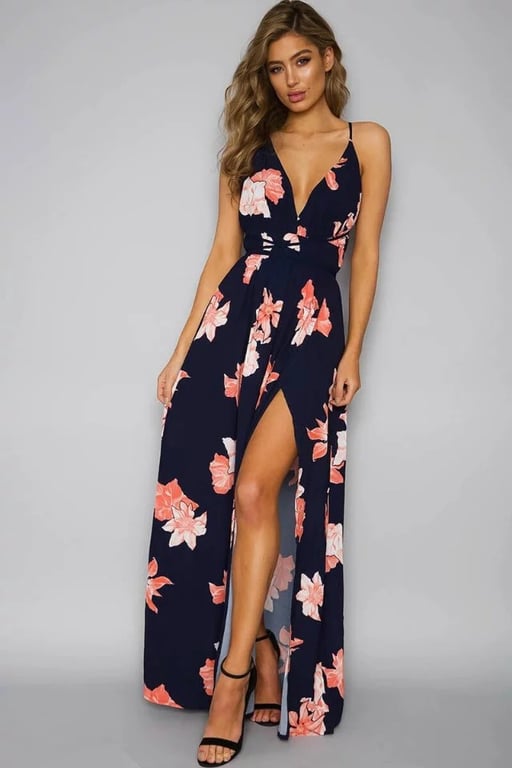 Dark blue beautiful evening gown with a slit.