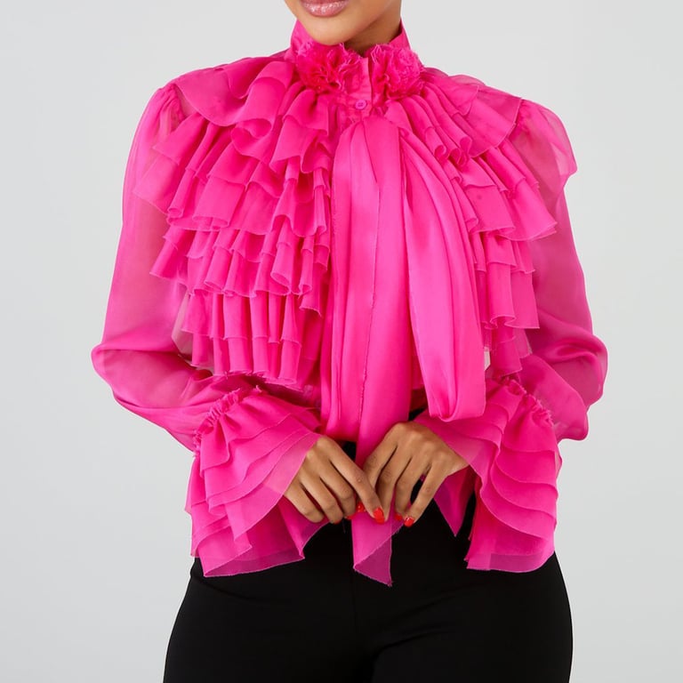 The blouse is entirely covered with ruffles and comes in a dark pink colour.