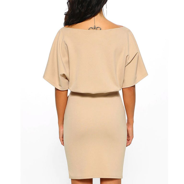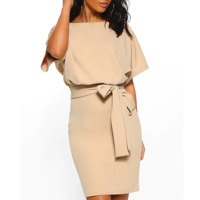 Women's fitted dress with short wide sleeves and a boat neckline. Tie belt at the waist. Elegant solid colour design. Available in multiple colours.