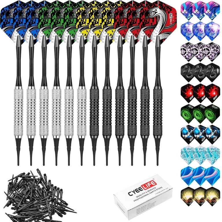 A set that includes darts, tips and spare flights. It is ideal for every active player. They are made from durable material. They have a good grip. Get this set today!