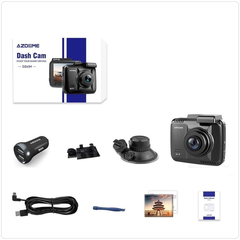 Package Contents: 1x camera, 1x 3.5 m power cable, 1x dual USB charger, 1x suction mount, 5x cable clips, 1x removal tool, 1x user manual