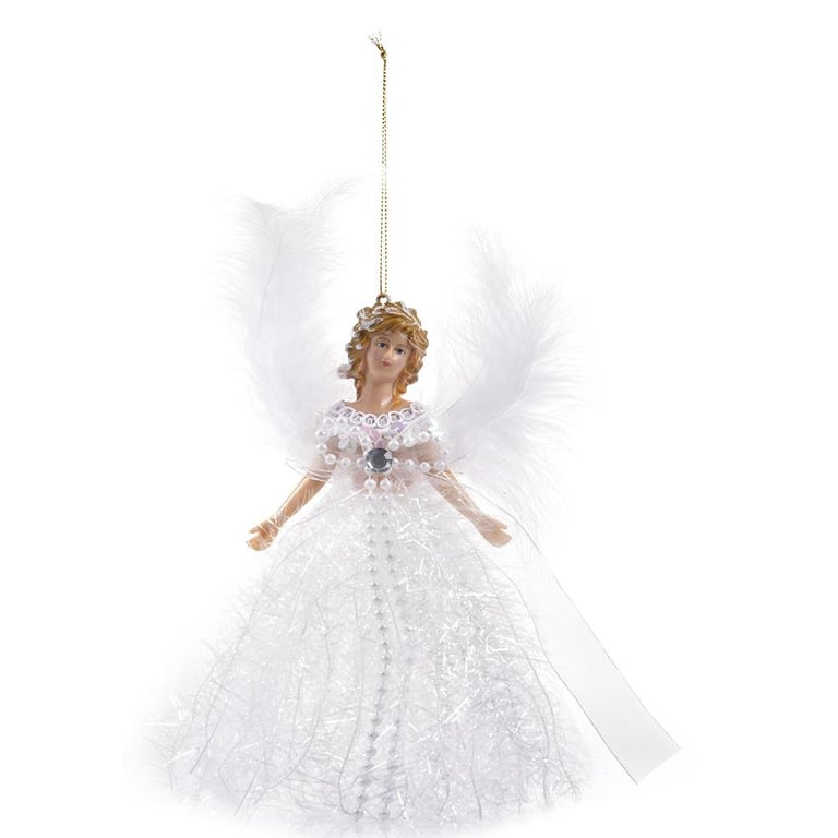 Beautiful hanging decorative figurine of an angel with feathered wings.