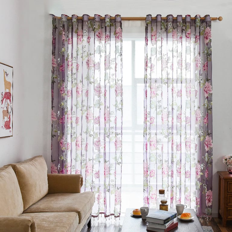 Decorative curtain with a delicate floral pattern.
