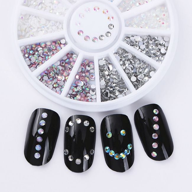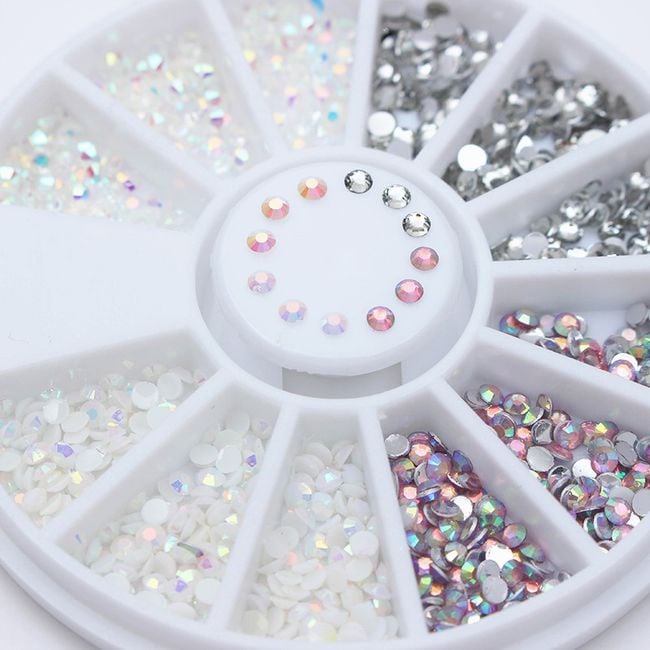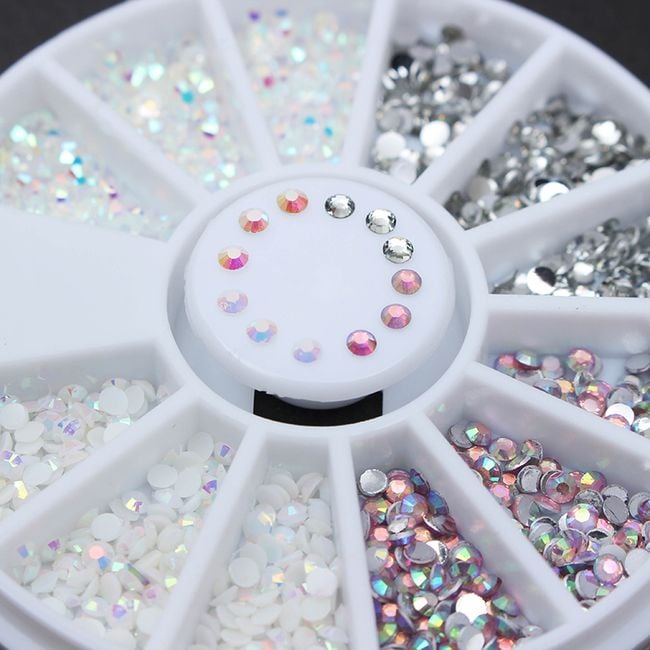 Adhesive decorations in the form of sparkling gems will beautifully brighten your nails. Thanks to the practical organiser, you will have the gems neatly sorted by colour. The package includes four colour variations – silver, pink, and two shades of white.