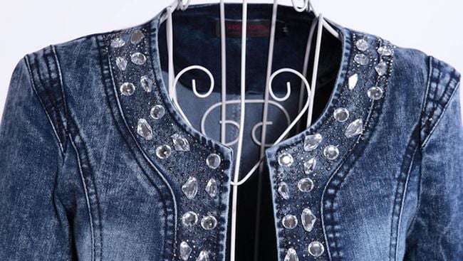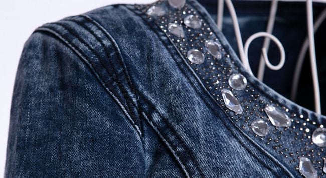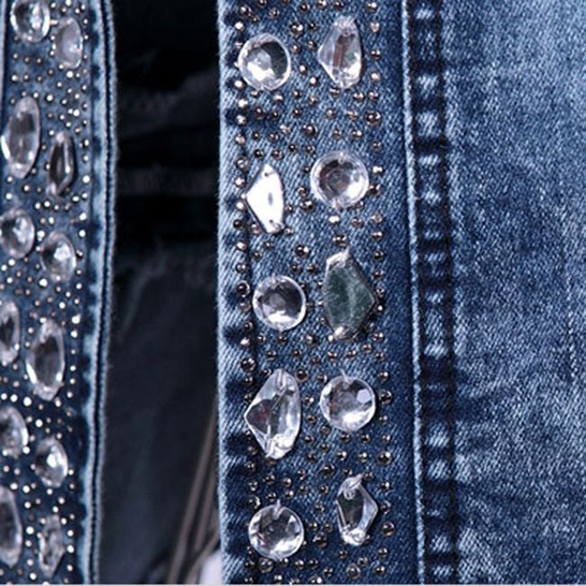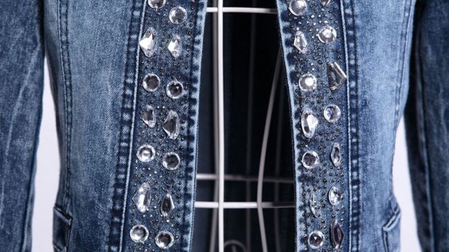 The women's denim jacket with a shorter cut is adorned with numerous crystals of various shapes.