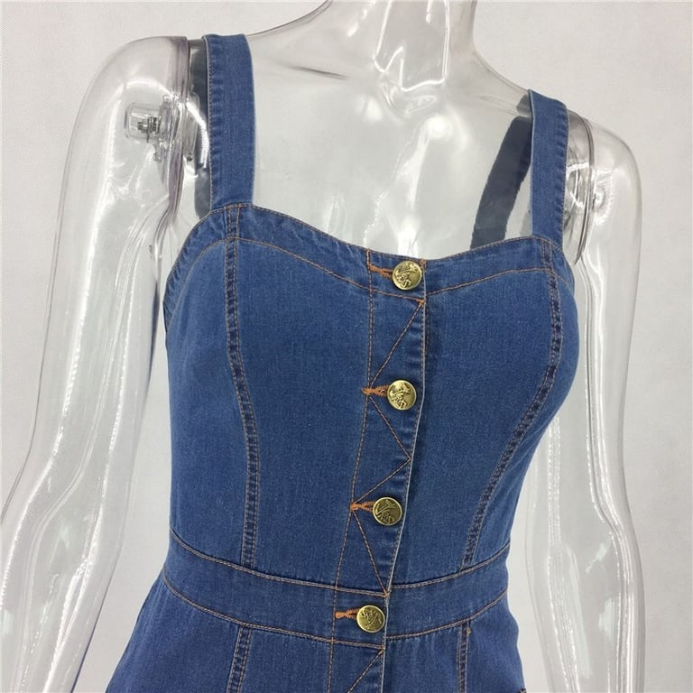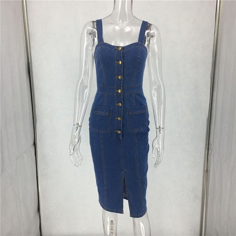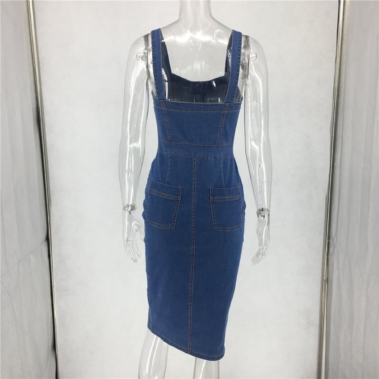 Stylish denim dress with straps, knee-length.