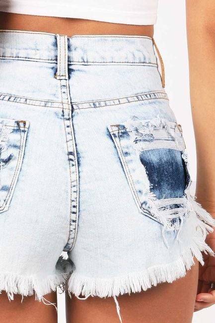 Women's high-waisted shorts feature large holes on the back pockets. The pockets, along with the frayed hems, make them a truly stylish fashion piece.