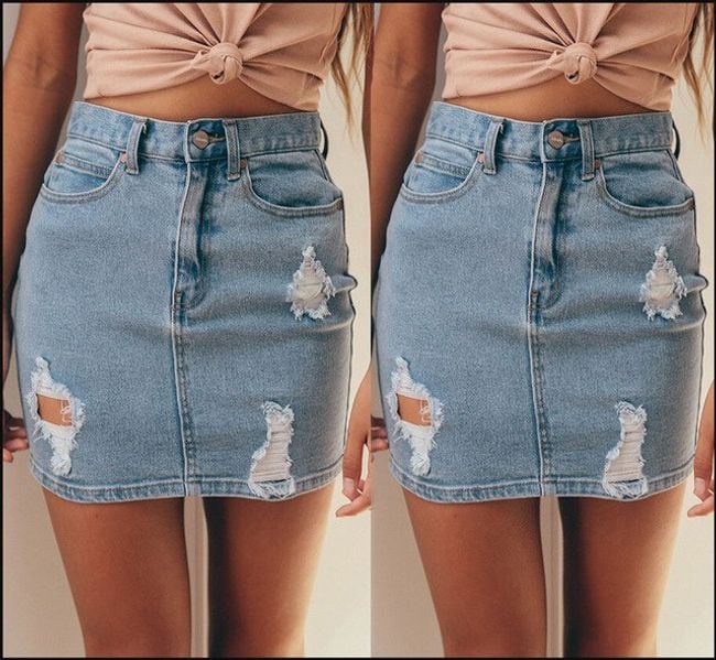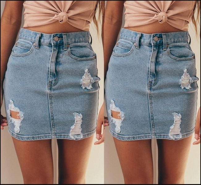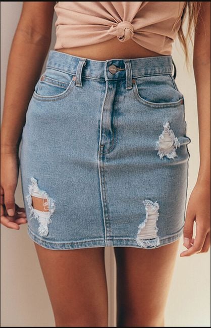 The skirt has a high waist and features pockets. It is distressed and available in 4 sizes.