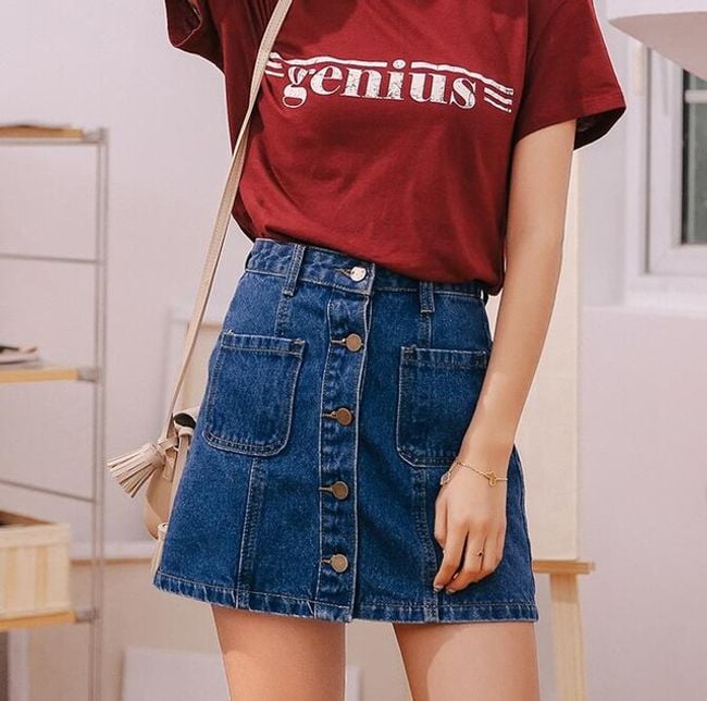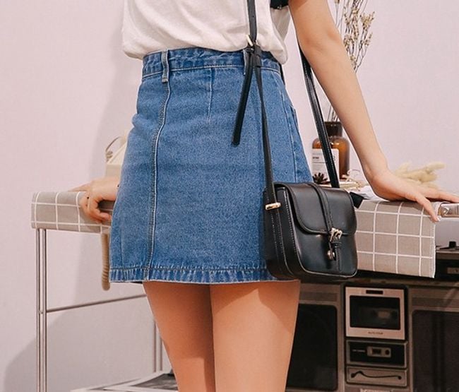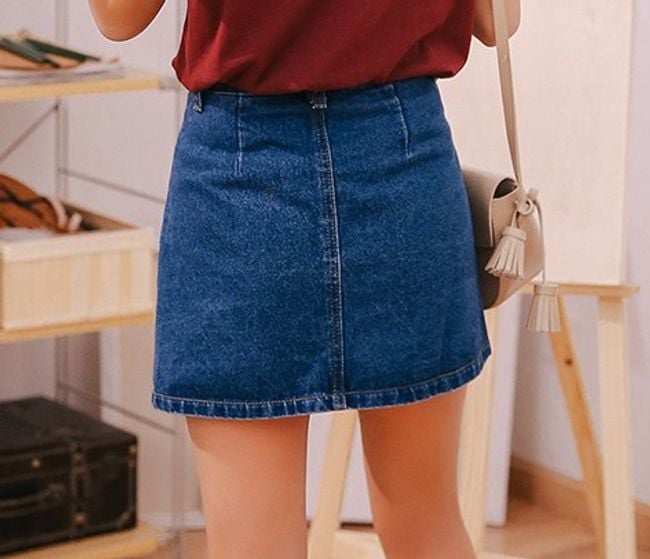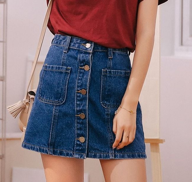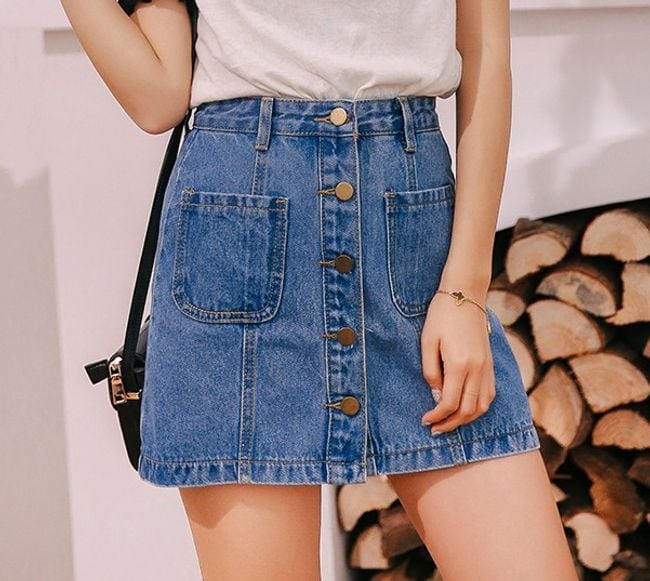 The high-waisted skirt features two practical pockets on the front. It is available in two shades of blue.