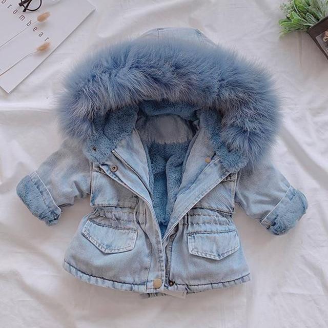 Denim winter jacket with fur. The fur is available in blue or pink.