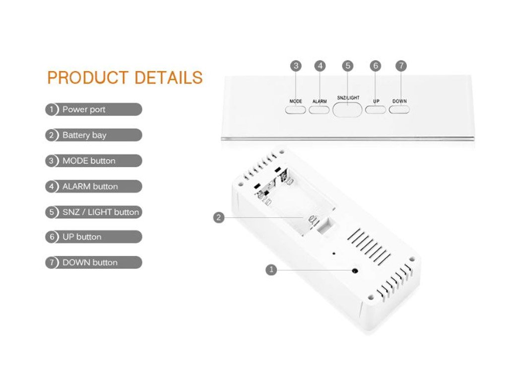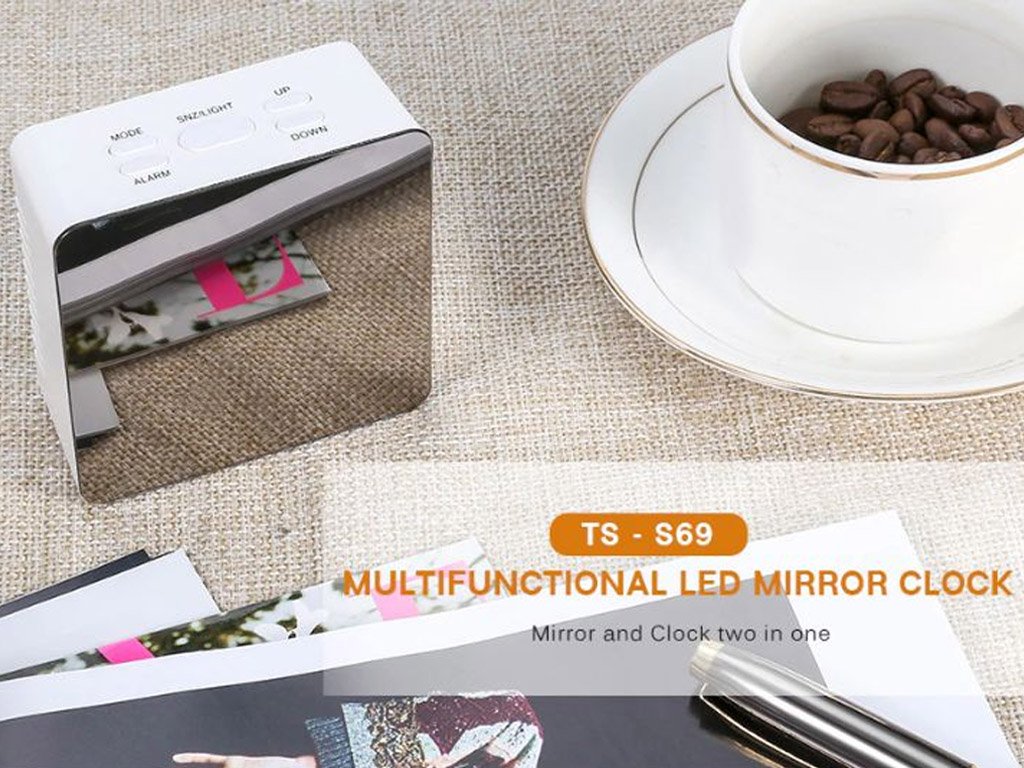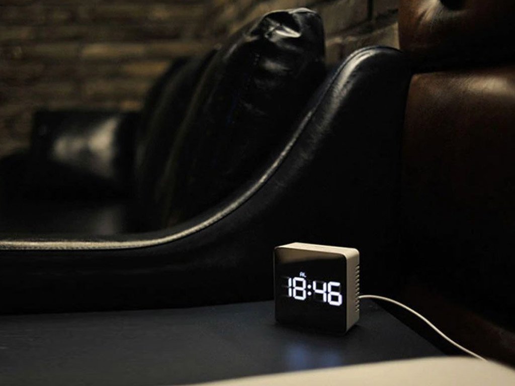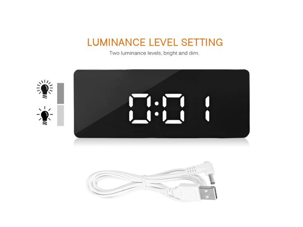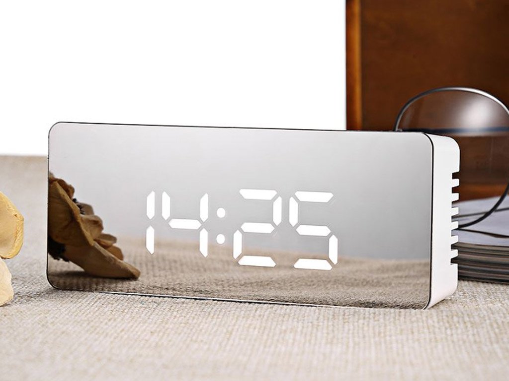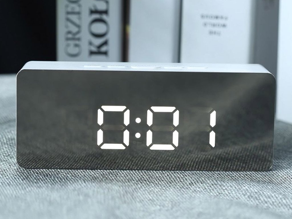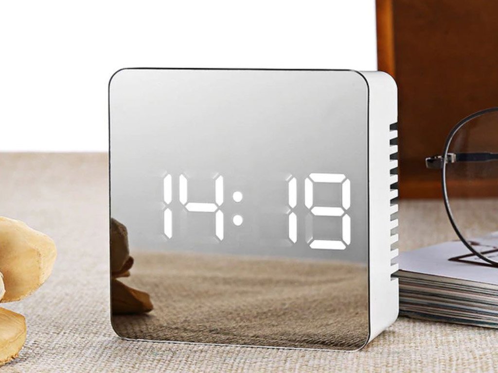 The alarm clock, clock, and thermometer on the display with white LED display combine multiple functions in the Mirror clock. The design of the clock stands out with its glossy front mirror piece. The front mirror panel is protected by a film.