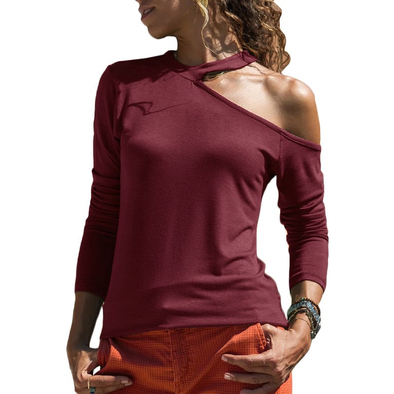 The top with an exposed shoulder is available in a comfortable cut at a discounted price with free shipping.