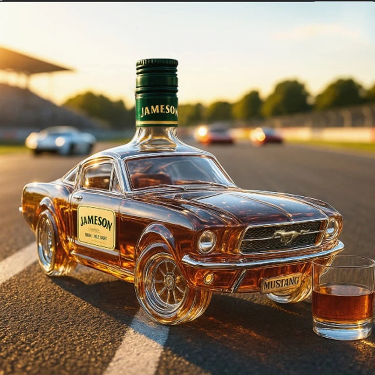 A designer whiskey bottle with a car motif. A fusion of classic style and power. This unique bottle, shaped like the legendary Mustang, will delight every whiskey lover and fans of American automotive history. The glass body, meticulous finish, iconic front grille, and a cap with a driver figurine make this bottle a collector's jewel. Perfect as a gift or a display piece for a home bar.