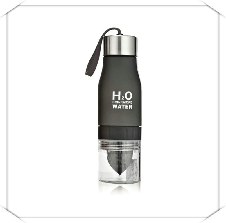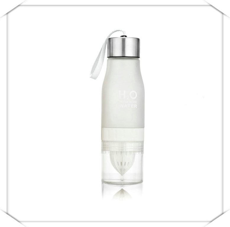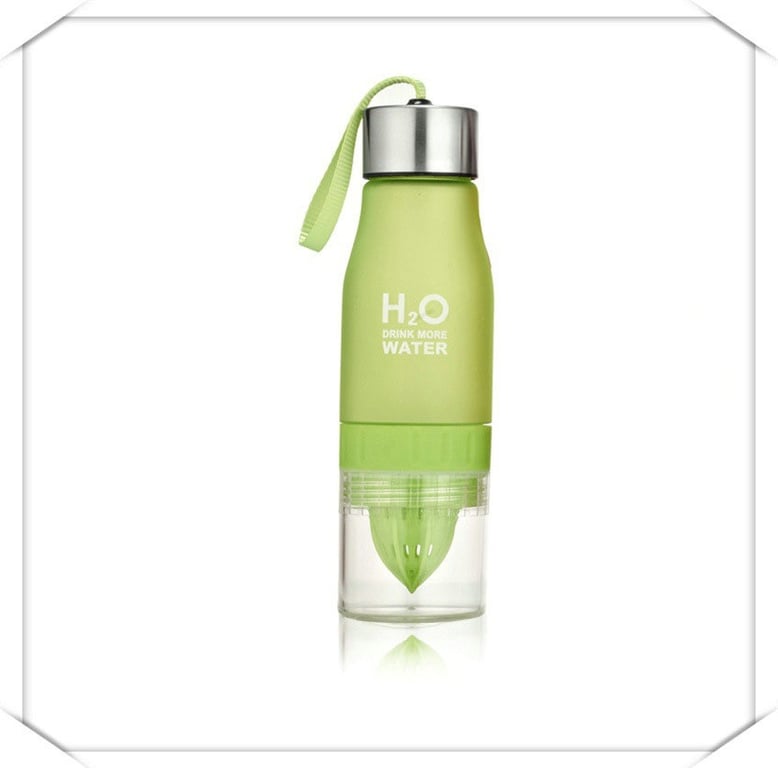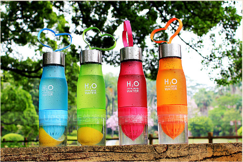 Original detox plastic water bottle, which is equipped with a juicer for lemon or lime at the bottom end.