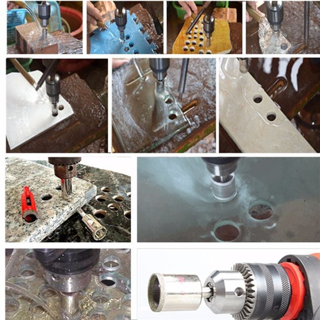 A set of diamond drill bits designed for drilling into hard materials using wet methods. The drill bit must be continuously cooled during use. Each drill bit is equipped with cooling holes and dust extraction holes. The set contains a total of fourteen pieces.