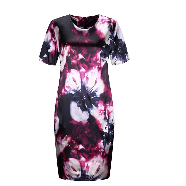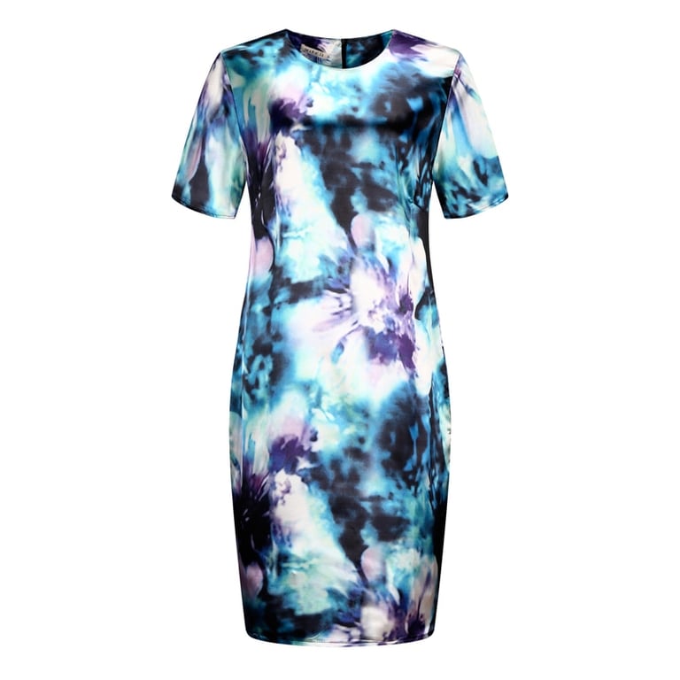 The dress features a round neckline and short sleeves.