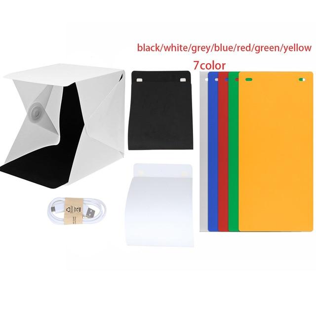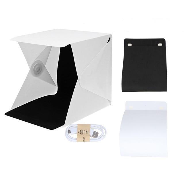 The tent is foldable and easily portable. The entire tent consists of plastic side panels and is assembled together using Velcro, making it simple to set up. On the top side inside, there is an LED strip at the front that serves to illuminate the photographed object. It contains 10 diodes in two rows. The LED strip is powered via a microUSB cable, which is included in the package, or by a standard phone charger.