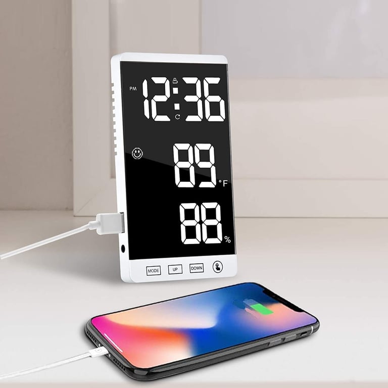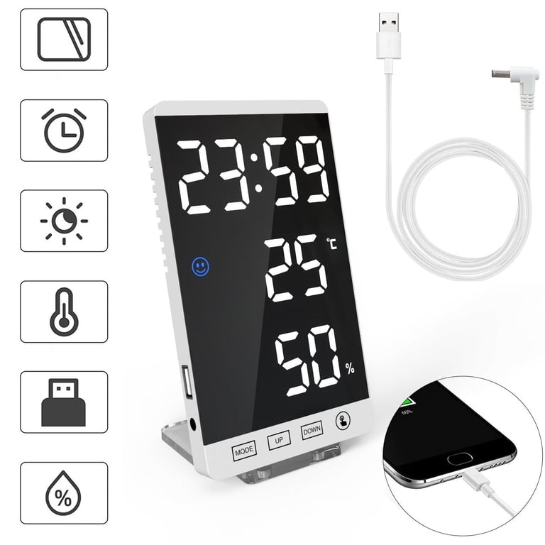 Features: USB port, hygrometer, thermometer, brightness adjustment, alarm