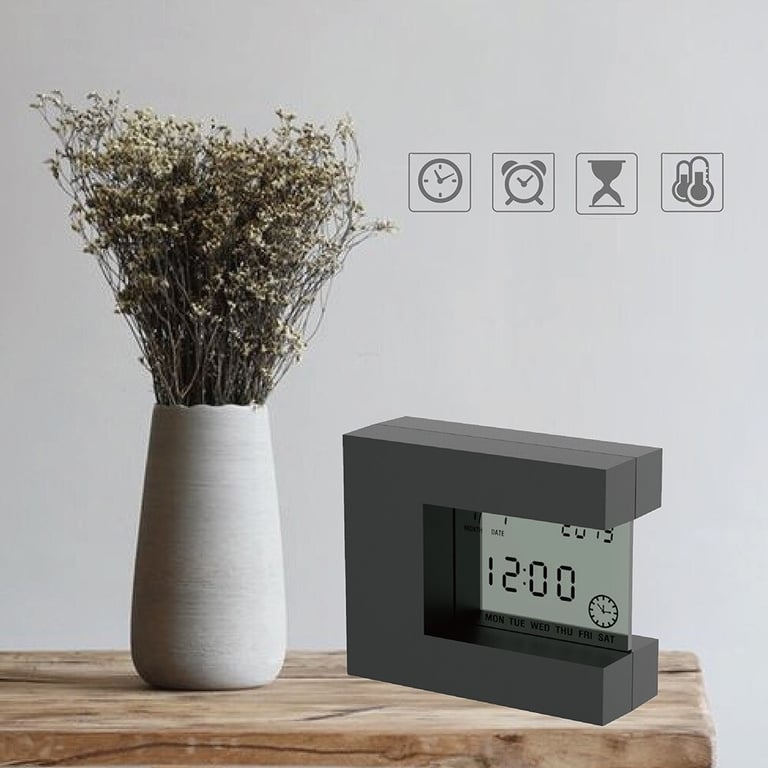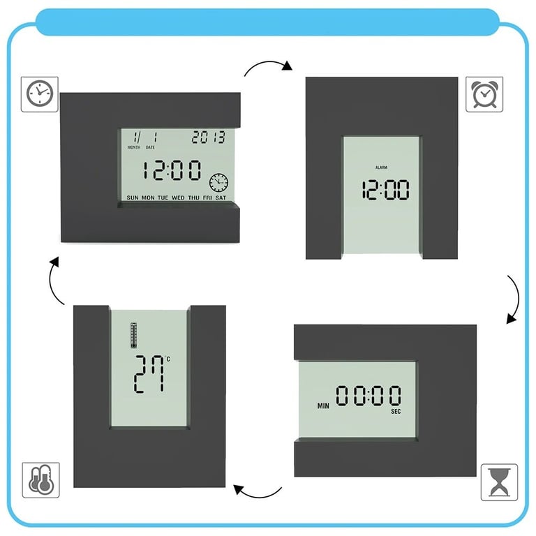 Functions: thermometer, calendar, alarm clock, automatic display rotation, timer