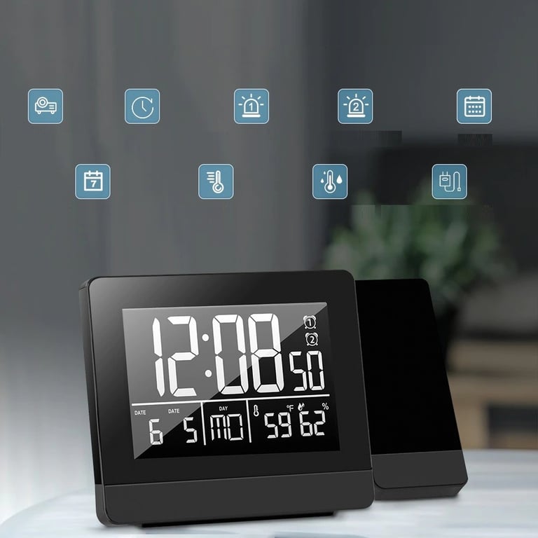Features: time projection, dual alarm, thermometer, calendar, hygrometer
