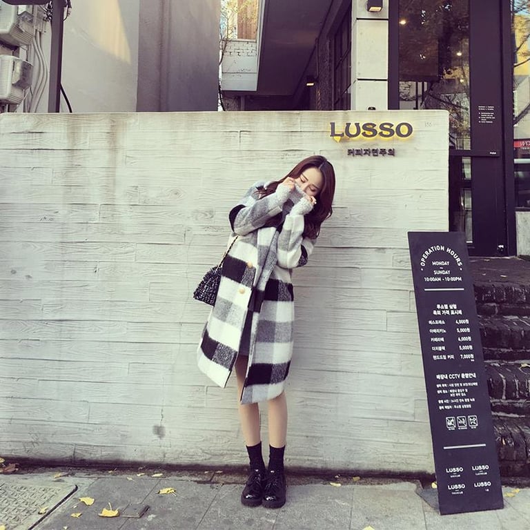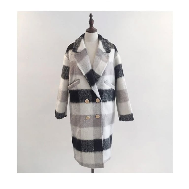 Women's jacket with a black and white checkered pattern. Loose oversized cut with lapels and button fastening. Two side pockets.