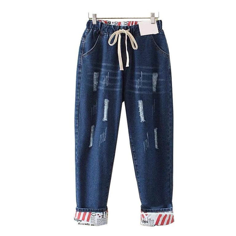 Women's boyfriend style denim jeans with an elasticated waistband. Loose fit with rolled-up hems featuring a print on the inside. Distressed effect. Available in two variants.