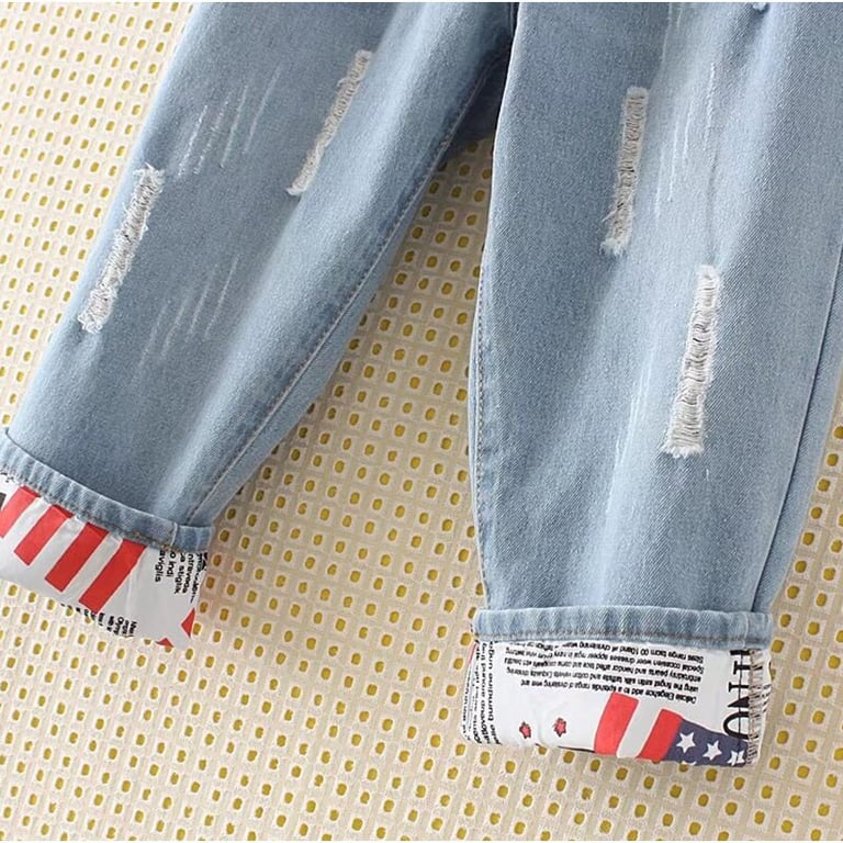 Women's boyfriend style denim jeans with an elasticated waistband. Loose fit with rolled-up hems featuring a print on the inner side. Distressed effect. Available in two variants.