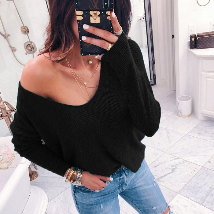 Women's sweater with a V-neckline. Loose, comfortable fit. Long sleeves. Available in multiple colour options.