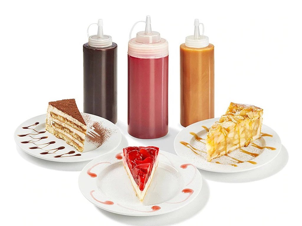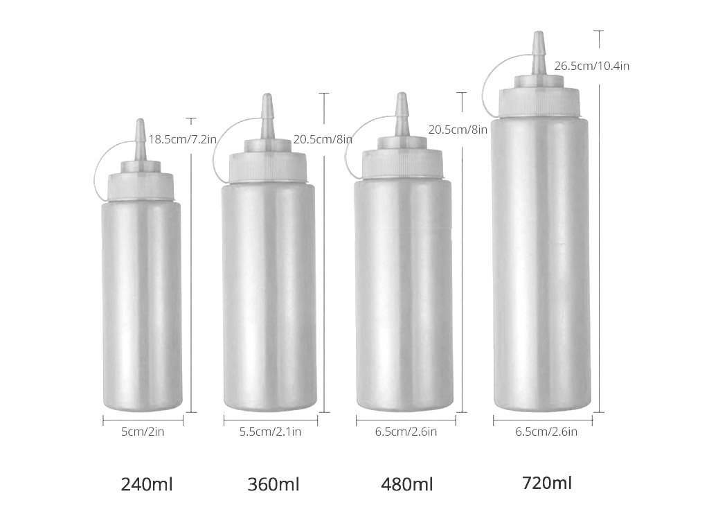Transparent sauce dispenser available in sizes 240 / 360 / 480 / 720 ml, designed for easy dispensing of ketchup, mustard, or mayonnaise. Ideal for buffets, fast food outlets, etc.