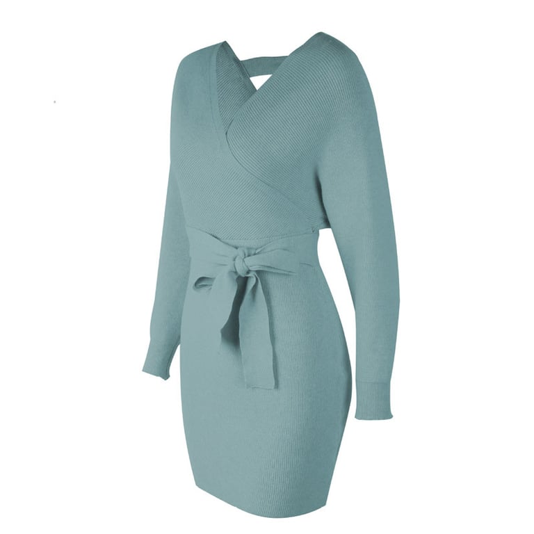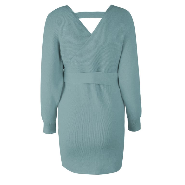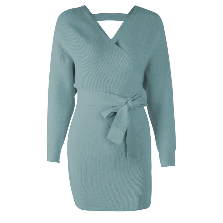 Women's sweater mini dress with a length just below the bottom, long sleeves, and a tie at the waist. The dress features a V-neckline. Available in several colour options.
