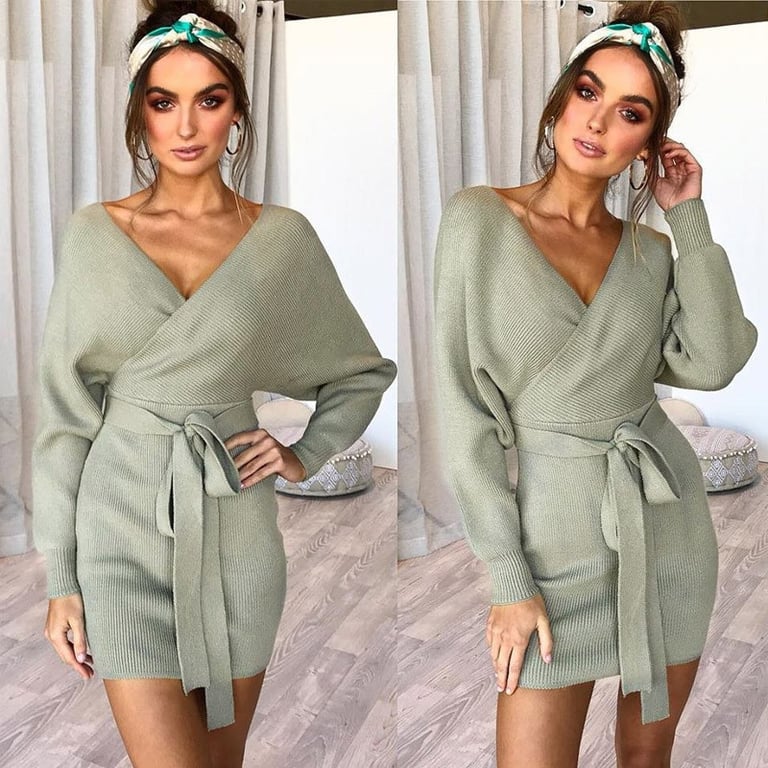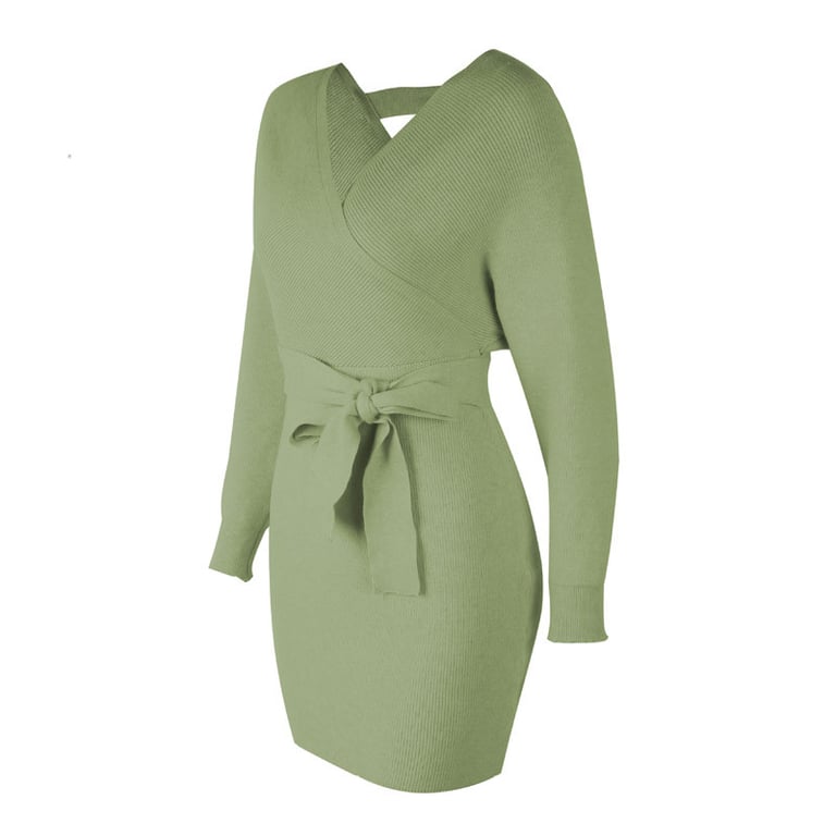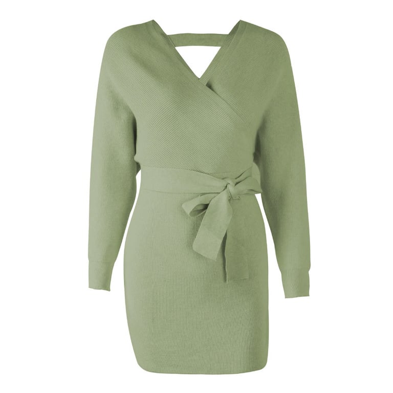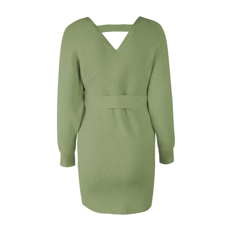Women's sweater mini dress with a length below the hips, long sleeves, and a tie at the waist. The dress features a V-neckline. Available in several colour options.