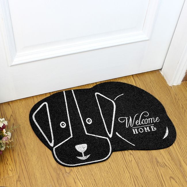 The doormat has a non-slip surface and features a dog design.