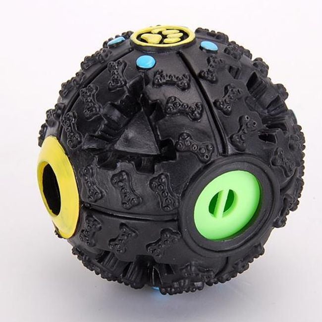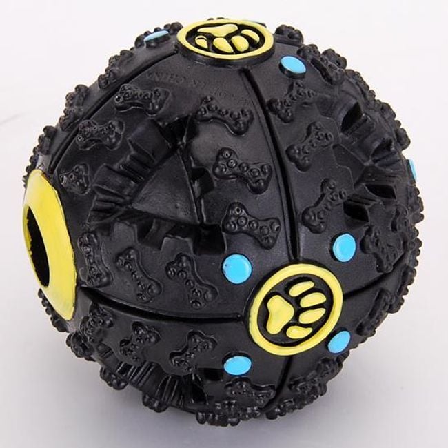 This dog toy is made from non-toxic material and emits sound effects (squeaking) when squeezed. A treat can be placed inside the toy. It will reliably entertain your pet.