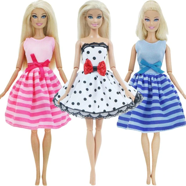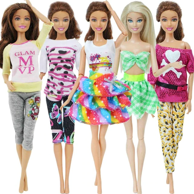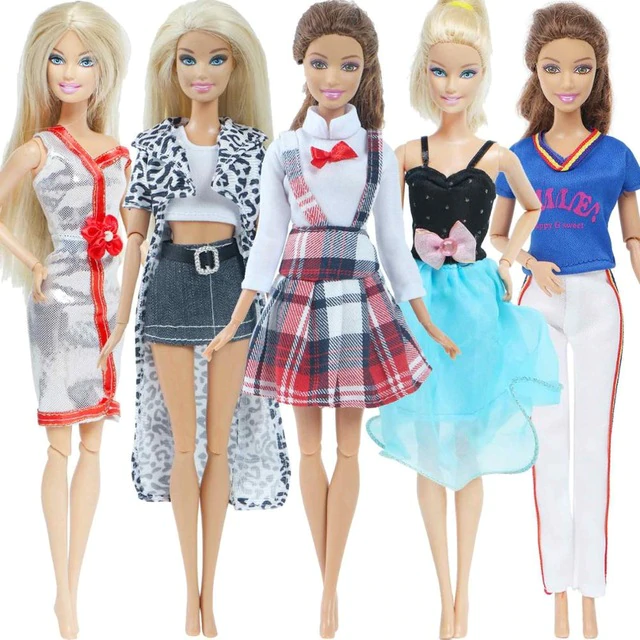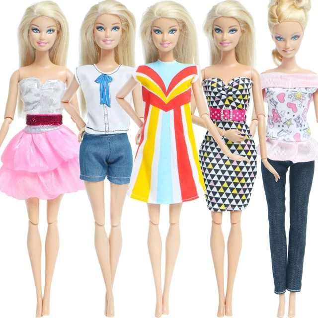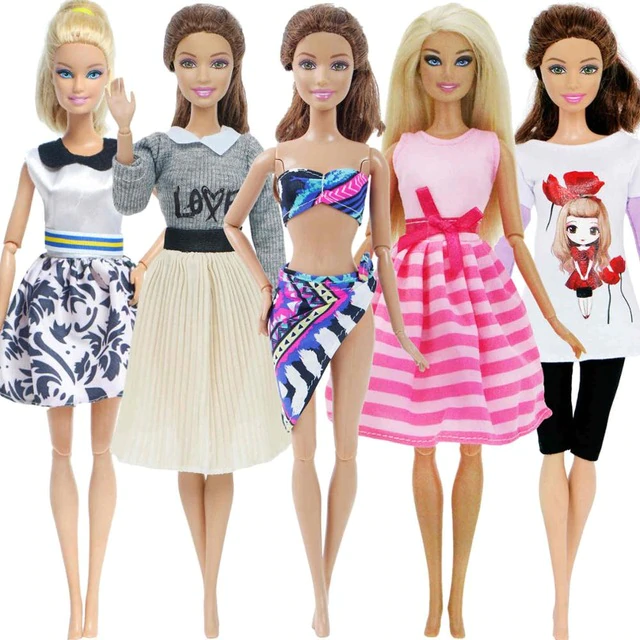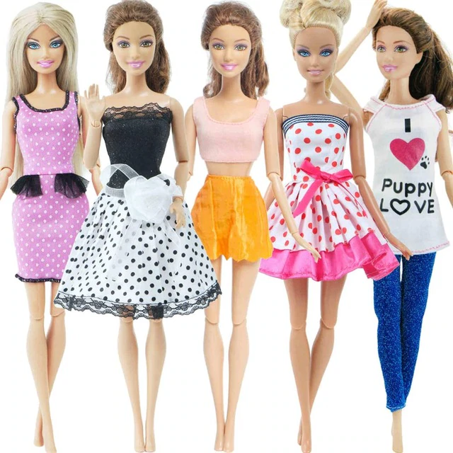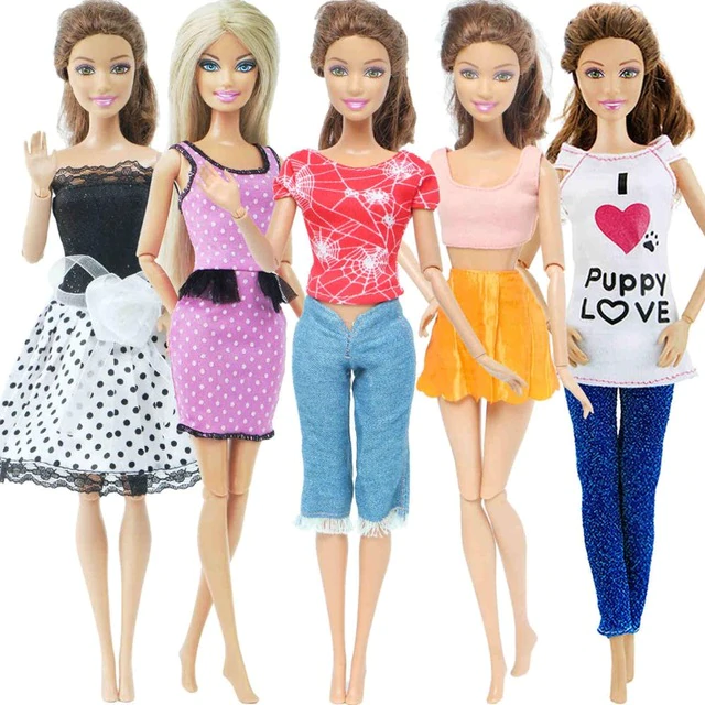 A set of 5 pieces of fashionable outfits for Barbie-type dolls. The clothing is suitable for dolls measuring 29 – 30 cm. The packaging does not include a doll.