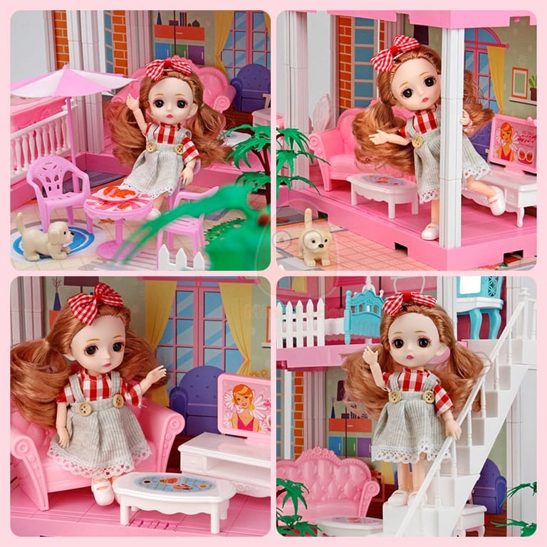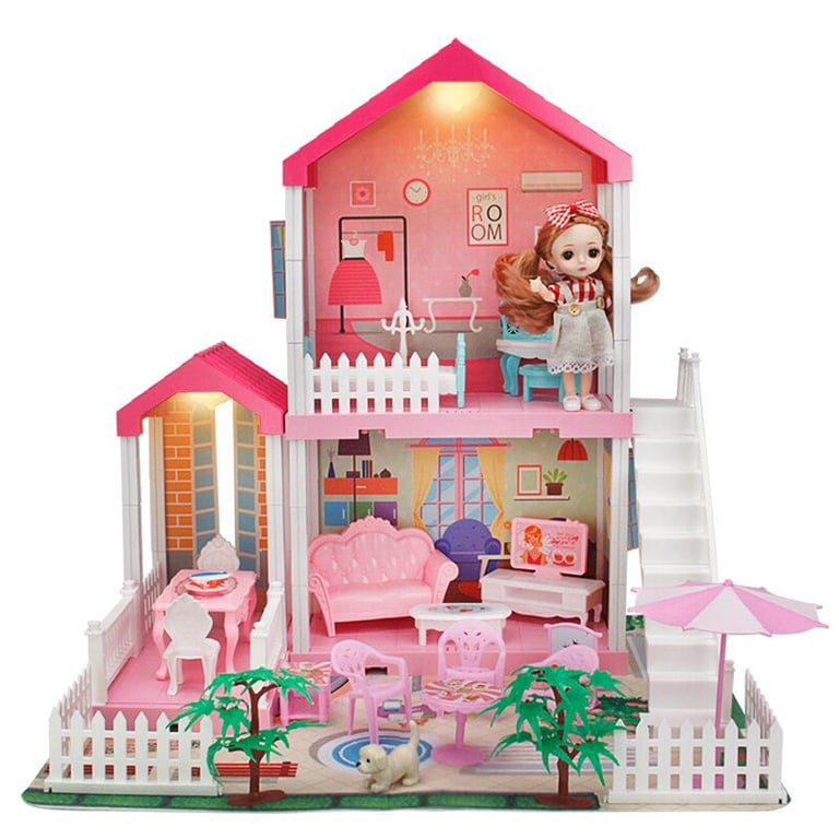 The package includes a dollhouse, furnishings for the house, and a doll.