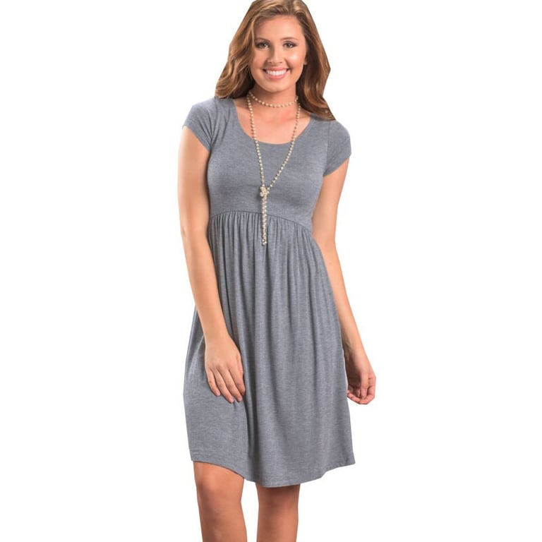 Women's lightweight dress with short sleeves and a round neckline. A-line skirt with gathering and knee-length. Available in multiple colour options.