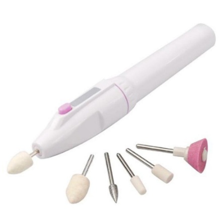 Electric nail file like from a salon. Five attachments for professional nail shaping and smoothing edges. Practical small design. Battery powered.