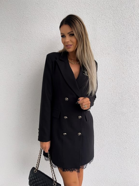 Elegant double-breasted women's blazer in a longer cut, suitable for wearing on its own as a formal dress.
