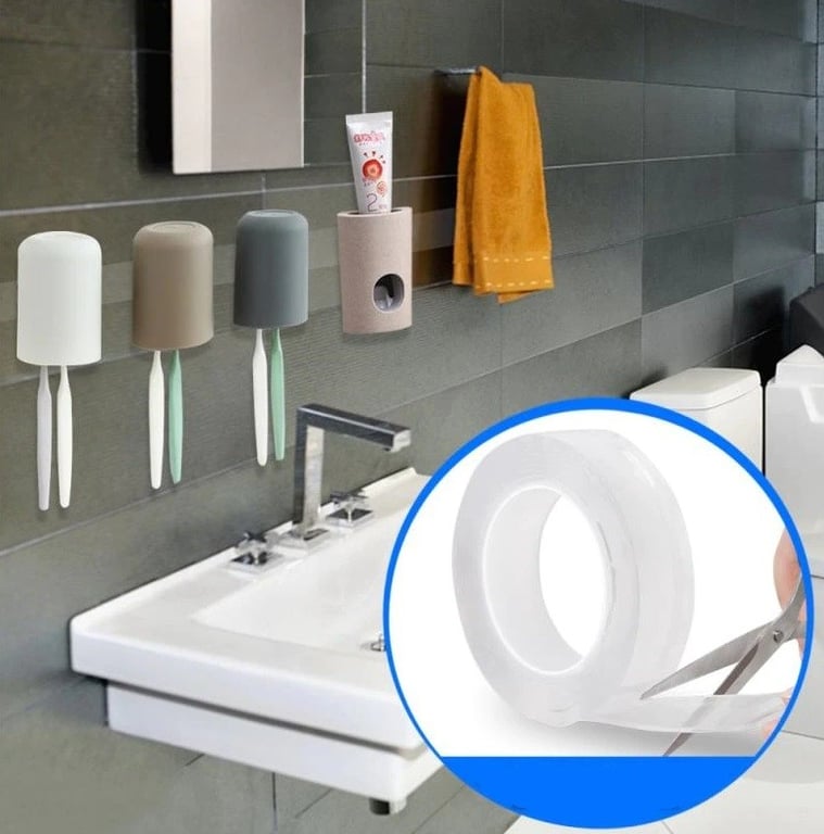 Double-sided transparent adhesive tape. The tape is washable and reusable. Applicable on any surface - wall, glass, wood, etc. An ideal helper if you want to attach something easily, firmly, and without drilling. The adhesive tape is also waterproof. It has a width of 20 mm.