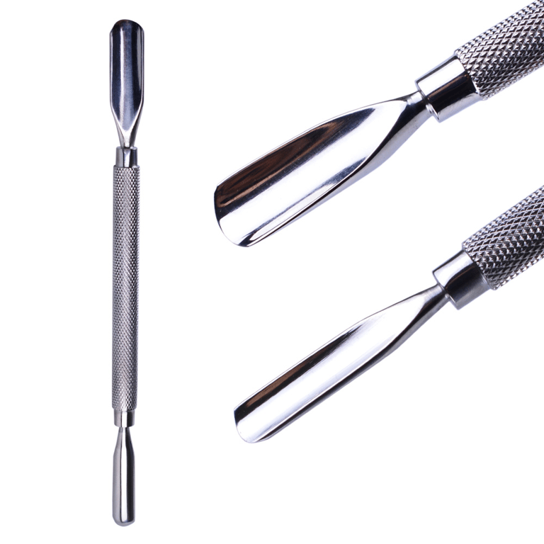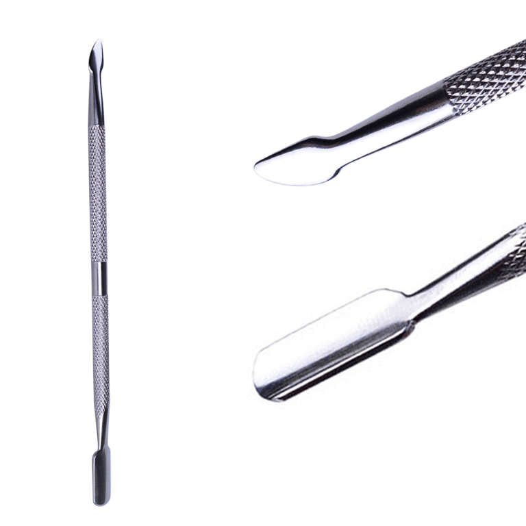 A double-sided cuticle pusher, one side features a rounded "spoon" for pushing back the cuticle around the nail, while the other side has a tapered "blade" for removing dead skin cells from the nail. Suitable for pedicure enthusiasts.
