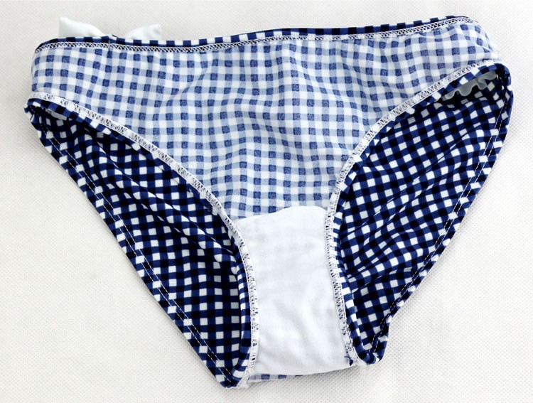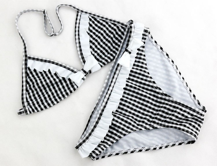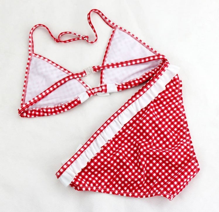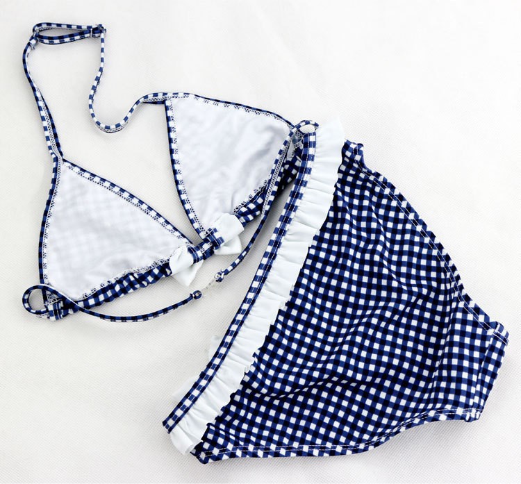 The swimsuit is a two-piece set with a checkered pattern and a small bow in the centre of the cups.