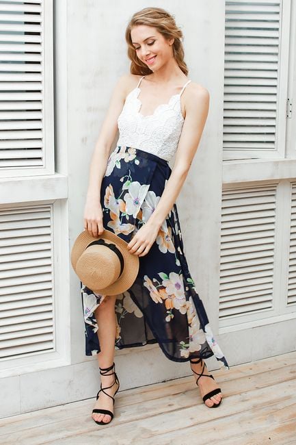 Women's lightweight dresses are the perfect summer outfit for hot days. The floral skirt combined with the sexy lace top creates a perfect combination. The size chart is provided below the product features at the bottom of the page.