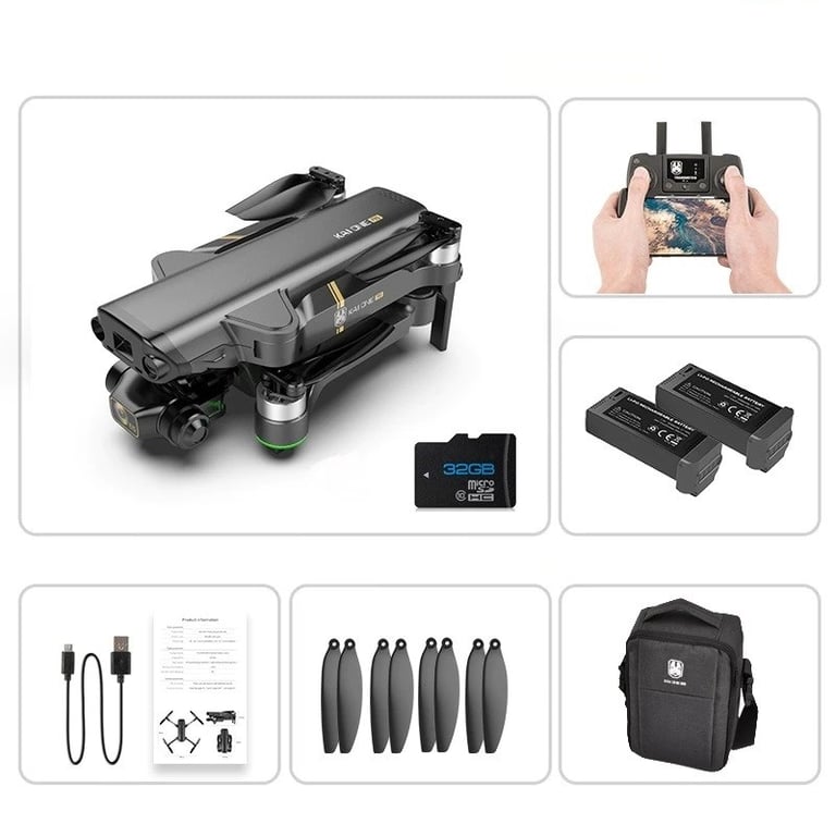 Package contents: 1x drone, 1x remote control, 2x batteries, 4x propellers, 1x charging USB cable, 1x drone backpack, 1x 32 GB Micro SD card