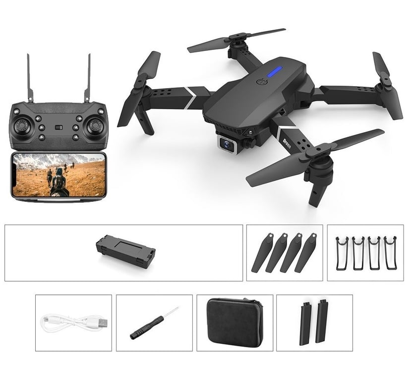 Package contents: 1x drone, 1x remote control, 1x battery, 4x protective guard, 4x spare propellers, 1x USB cable, 1x screwdriver, 1x bag