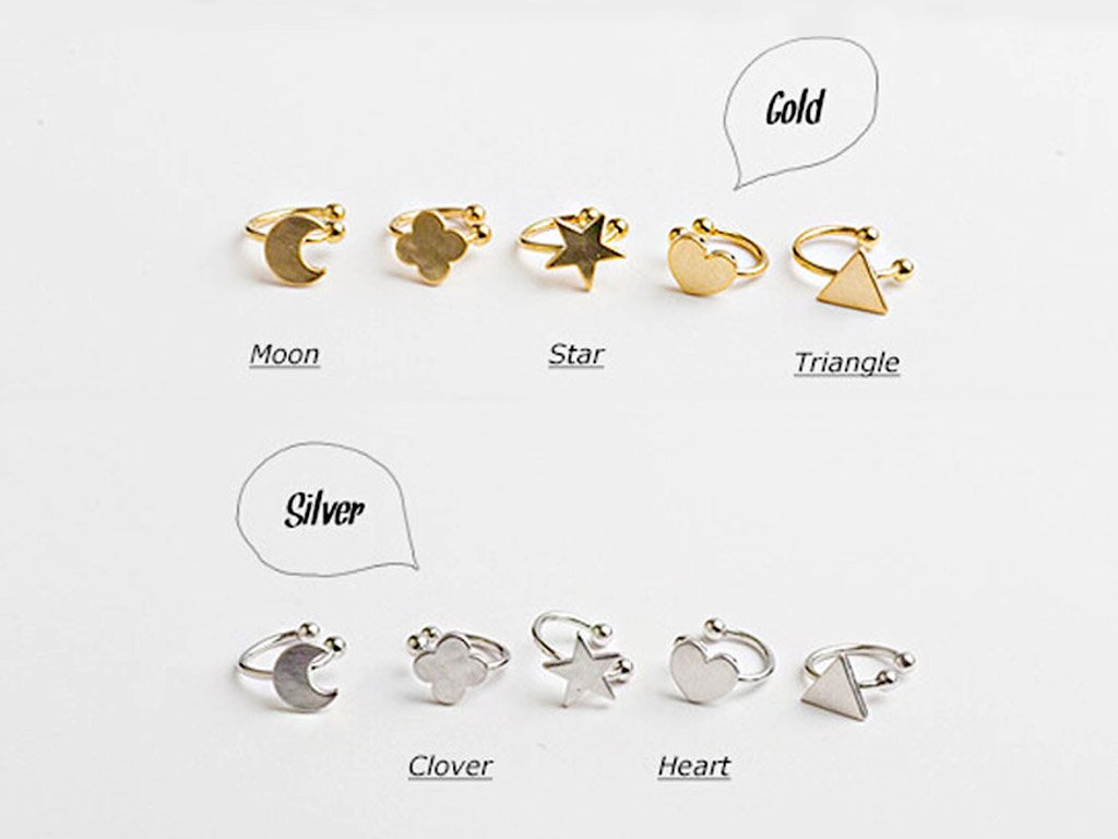 Ear earrings with symbols of the moon, four-leaf clover, star, heart, and triangle.