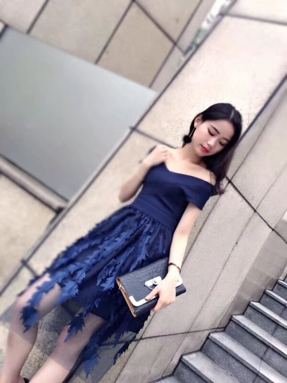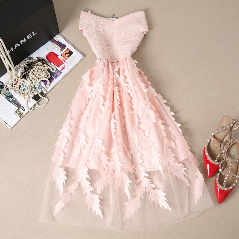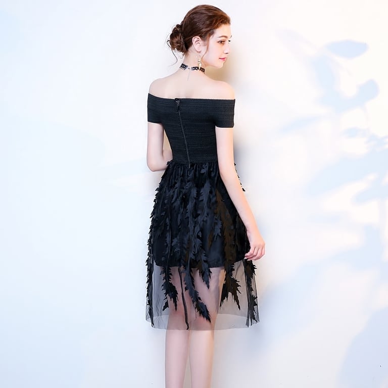 Exposed shoulders and a tulle layer on the skirt with original embellishments.