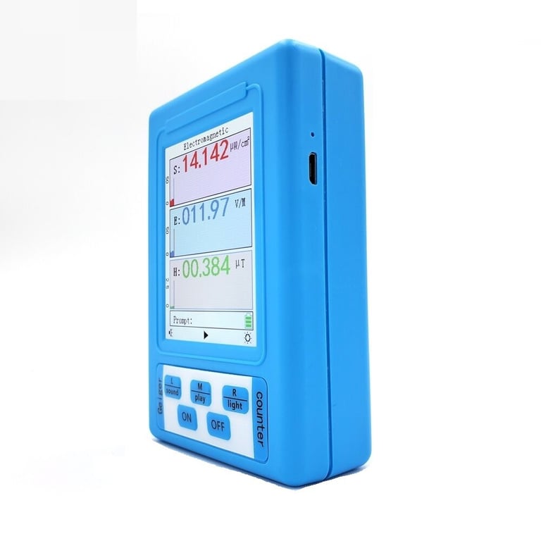An easy-to-use and readable electromagnetic radiation meter. Made from high-quality ABS. It can measure the values of the magnetic field (µT) and electric field (V/m). High sensitivity and measurement accuracy. The electromagnetic radiation meter also features an alarm function and is equipped with a backlit readable display.