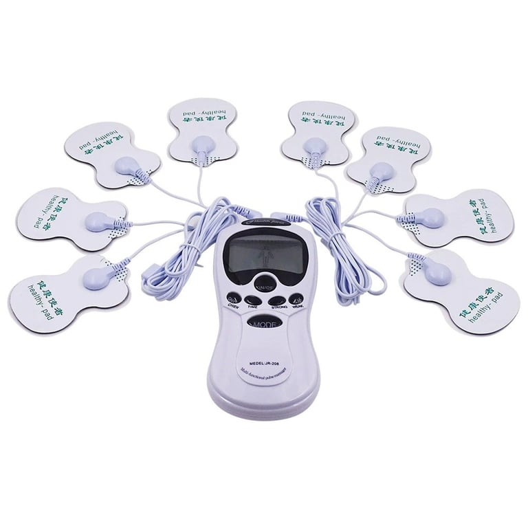 Package contents: 1x electrostimulator, 8x electrode pad, 2x electrode wire, 1x USB cable