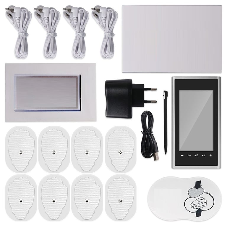 Contents of the package: 1x electrostimulator, 1x touch pen, 8x electrode pad, 4x electrode wire, 1x EU adapter, 1x charging cable, 1x mat