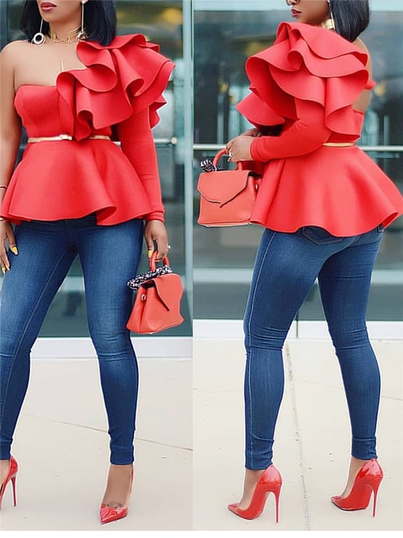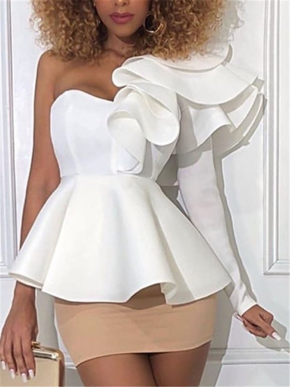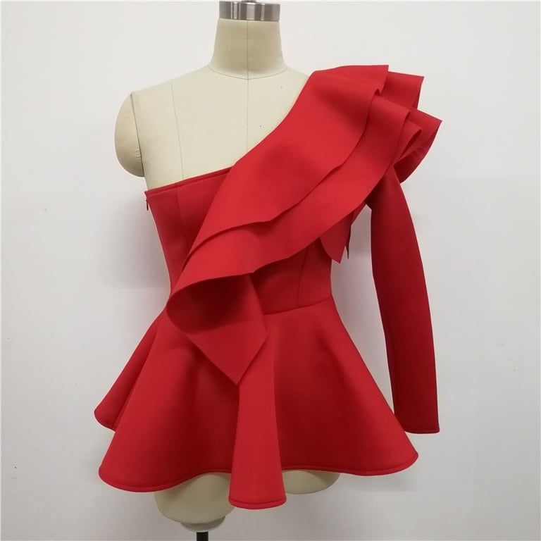One arm is exposed while the other is covered with ruffles and a fitted sleeve.